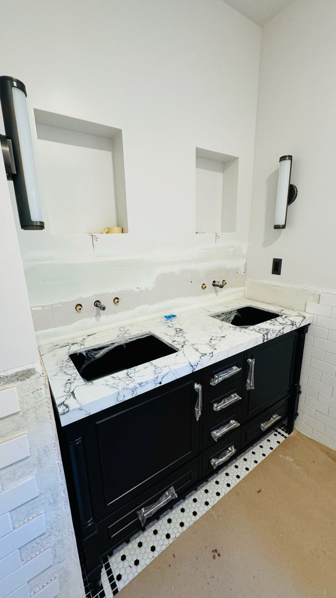 Remodel of main bathroom to make more room and better functionality for this family. Created more space to allow for a double vanity, added a full bath tub, privacy wall for the toilet and upgraded lighting. The new design incorporated all the period piece details to keep in harmony with the overall aesthetic of the home.